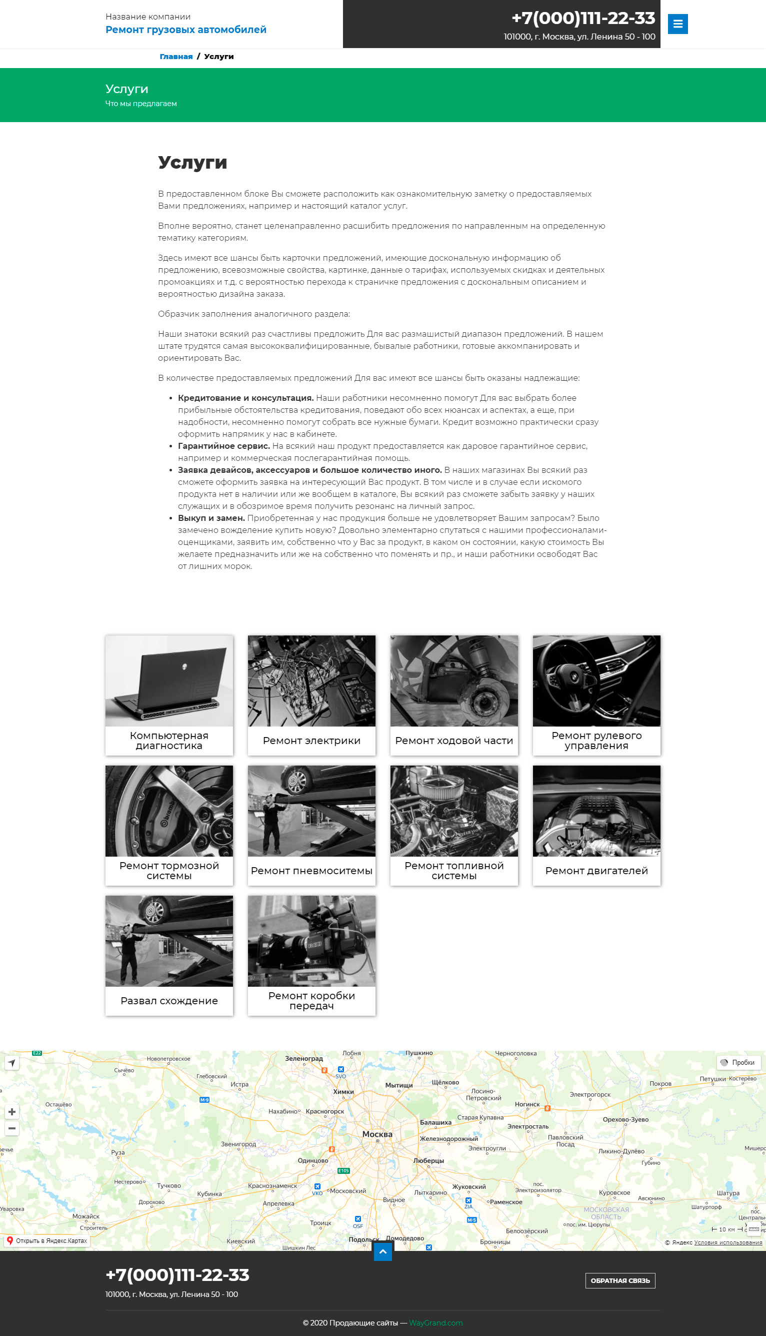 - Промогалерея "Починка грузовиков и полуприцепов" с кнопкой призыва к действию "Записаться на ремонт"